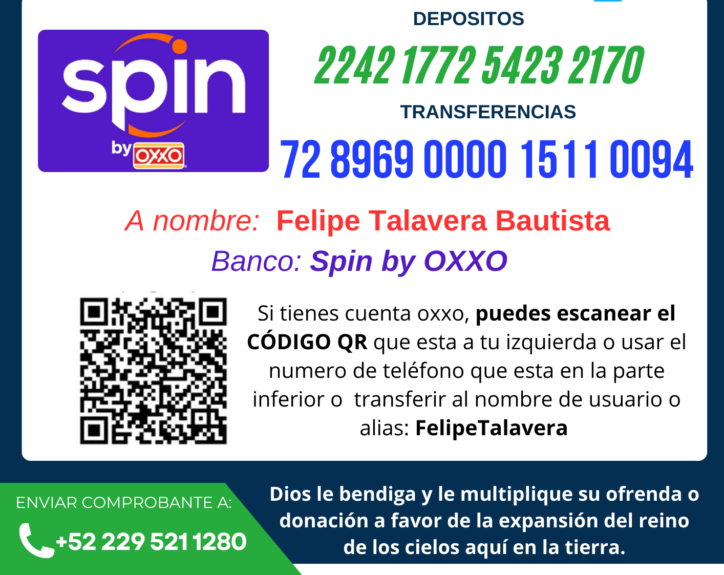 El Código QR que esta en la imagen de la izquierda o los números que ahí se muestran, son para uso aquí en México, si usted desea transferir desde otro país puede contactarnos desde la sección CONTACTA NOS o en el correo que esta al final de esta pagina, si deseas bendecir nuestro ministerio de una manera mas practica y rápida te invito a hacer clic en el enlace de abajo o en el Cogido QR que esta abajo del enlace y te llevara a la pagina de
